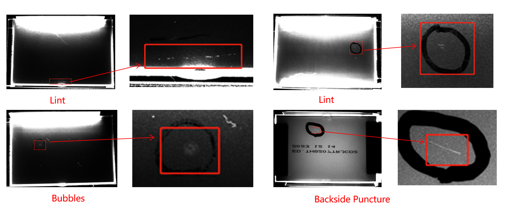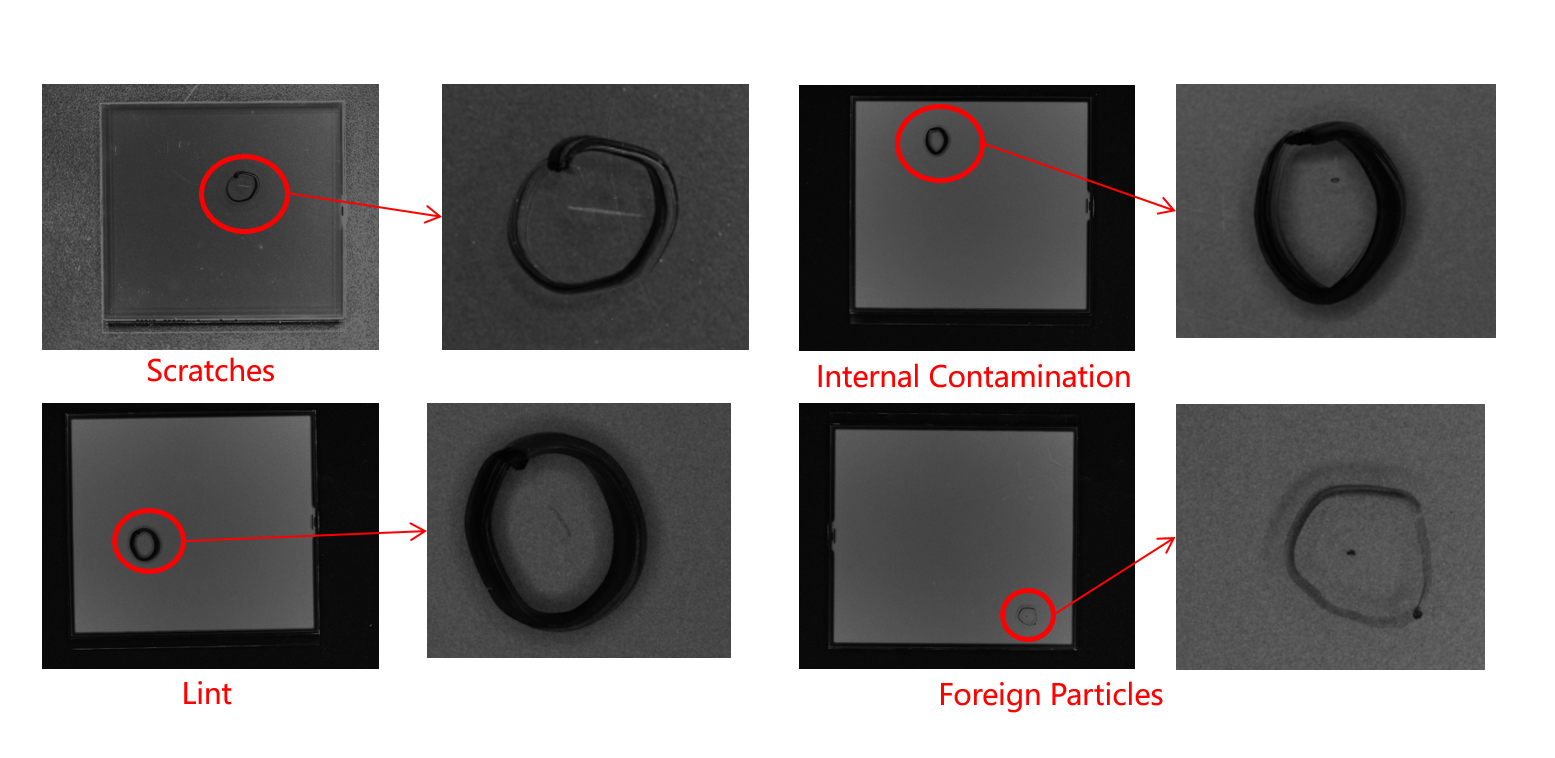 Defect DetectionDefects including scratches, fibers/lint, internal contamination, bubbles, foreign particles, cracks, poor cutting, misalignment, white spots, water marks, breakage, etc.