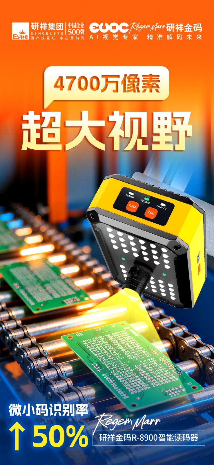 作为行业首款4700万像素的智能读码器,zoty中欧R-8900单次识读即可覆盖500+条码,视野范围高达常规读码器的25倍。
